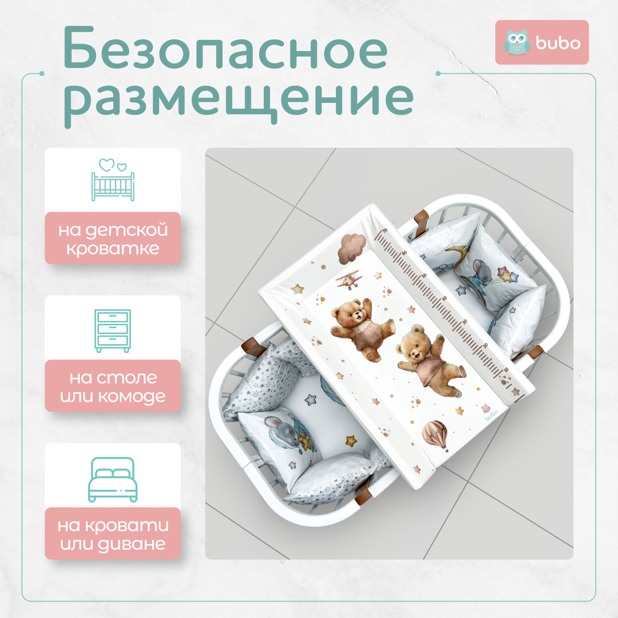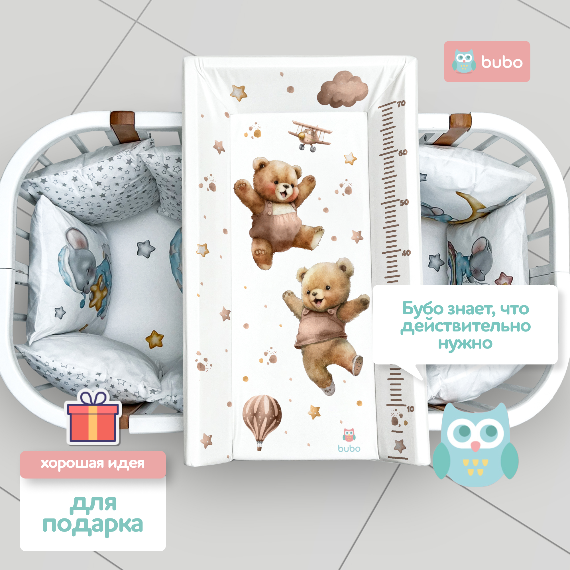 Доска для пеленания BUBO BABY LUX PRO 80х50 см с фиксаторами и ростомером - это идеальное решение для комфортного ухода за вашим малышом.