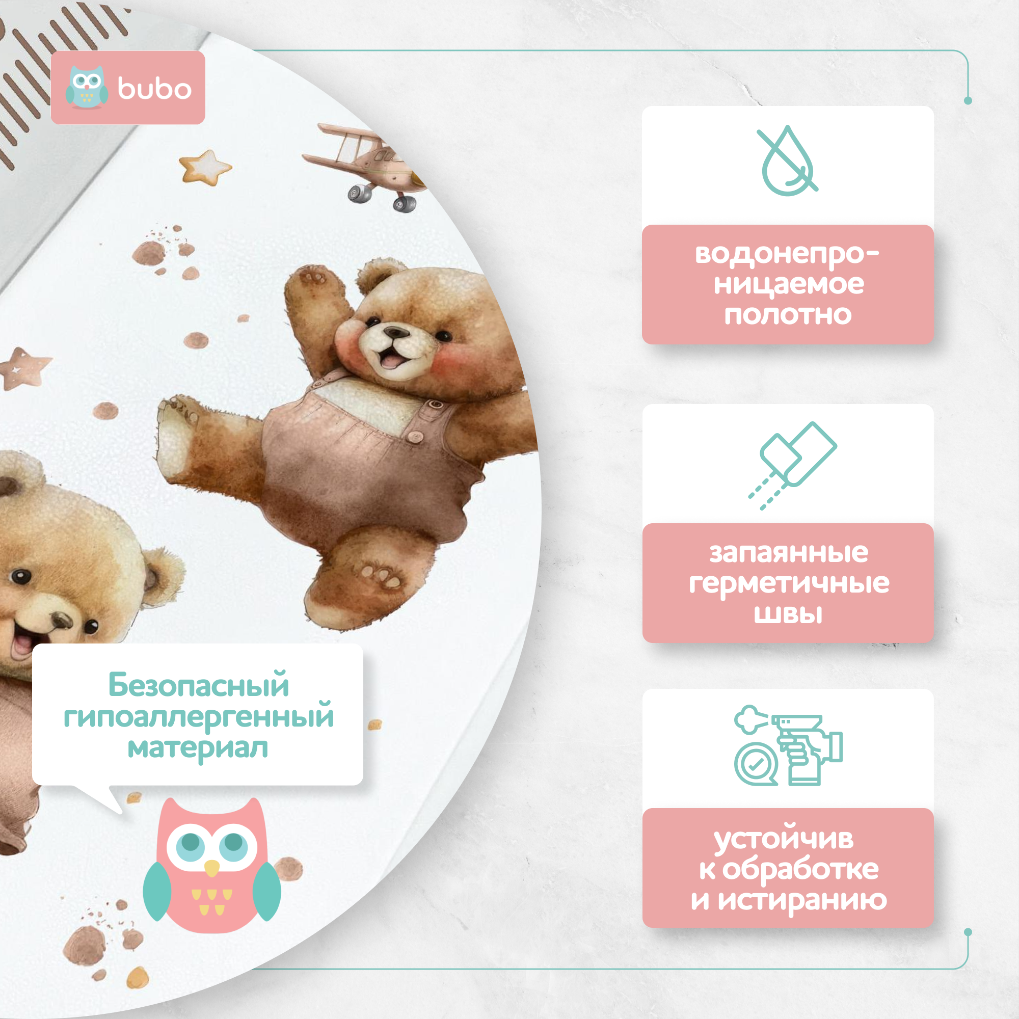Доска для пеленания BUBO BABY LUX PRO выполнена из высококачественных материалов. Она прочная, надежная и долговечная. Благодаря этому, вы можете быть уверены, что она прослужит вам долгое время и сохранит свою функциональность. Непромокаемый и гипоаллергенный материал поверхности совершенно безопасен для тела и удобен в гигиене. Его достаточно протереть влажной салфеткой и он снова идеально чистый.