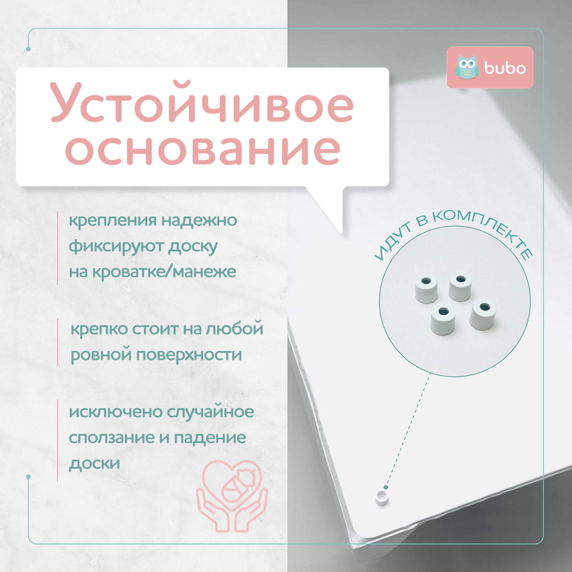 Дно пеленальной доски совершенно гладкое и имеет антискользящее покрытие для использования на ровных поверхностях: комод, стол, кровать, диван. В комплекте четыре универсальных крепления, которые легко установить в любой конфигурации для фиксации на детской кровати, манеже или любой другой безопасной конструкции.