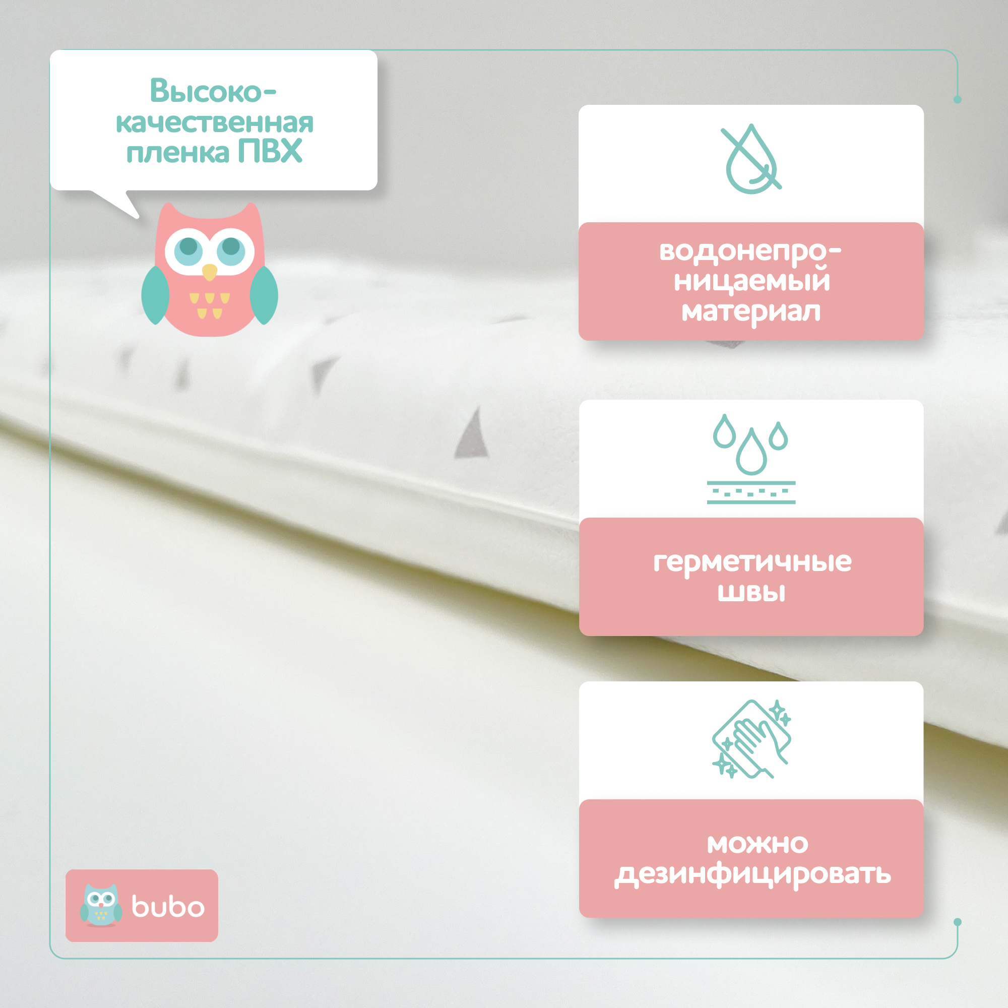 Пеленальный матрас BUBO BABY "SKY" не имеет тканных материалов и швейных швов. Герметичность изделия дает возможность быстро очистить и обработать изделие после использования, не требуется тратить драгоценное время на стирку и сушку матрасика. Это позволяет вам легко и быстро поддерживать чистоту и гигиену вокруг вашего малыша.
