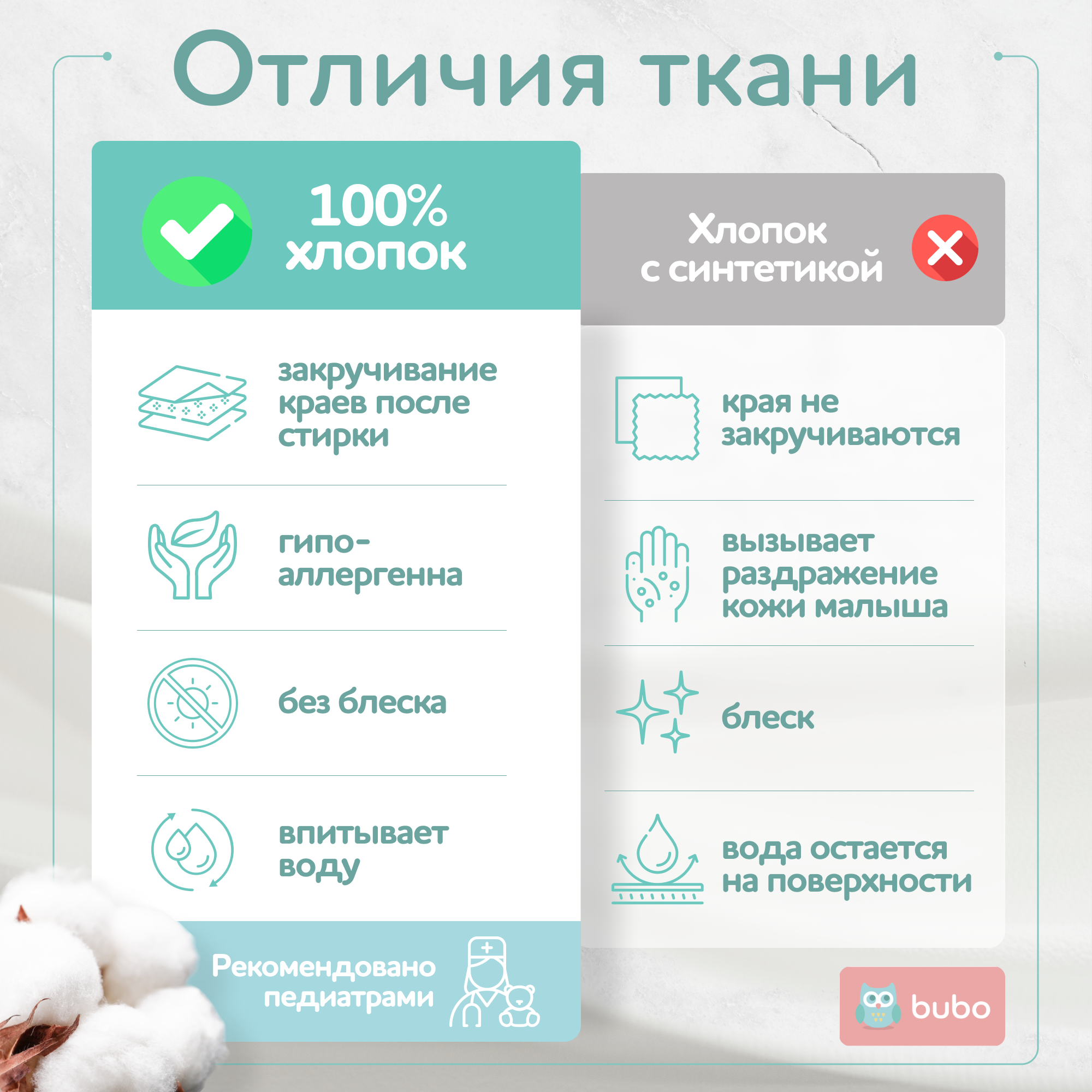 Пеленки текстильные BUBO BABY SOFT - идеальный выбор и незаменимый помощник для заботливых родителей, которые стремятся обеспечить комфорт и безопасность своего малыша. Этот набор из 5 (пяти) пеленок размером 100 х 110 см выполнен из ткани – кулирная гладь (100%) - гладкого и уютного хлопка высокого качества плотностью 145 г/кв.м, обладающего рядом преимуществ в виде комфортного пеленания и ухода за новорожденным.